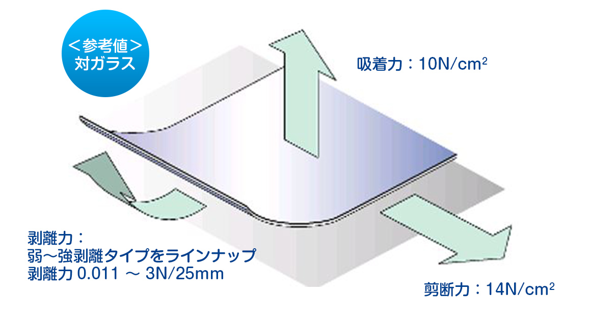 非粘着なのに高い吸着力をもつ機能性フィルムです。ガラス、金属、樹脂などの平滑面にしっかりと貼りつき、かつきれいに剝がせる特徴を持っています。